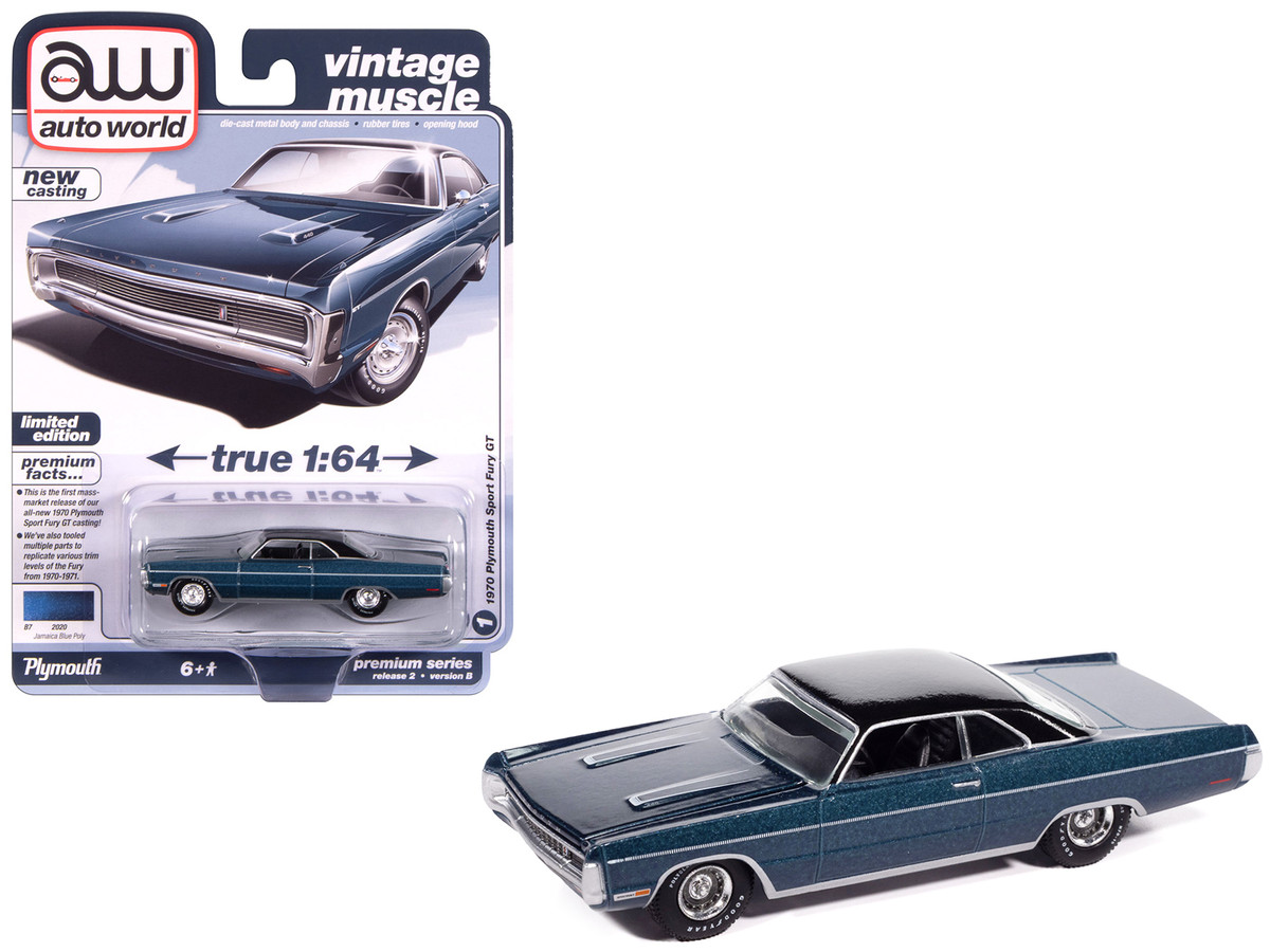 - 1970 Plymouth Sport Fury GT Jamaican Blue Metallic with Black Top "Vintage Muscle" Series 1/64 Diecast Model Car by Auto World