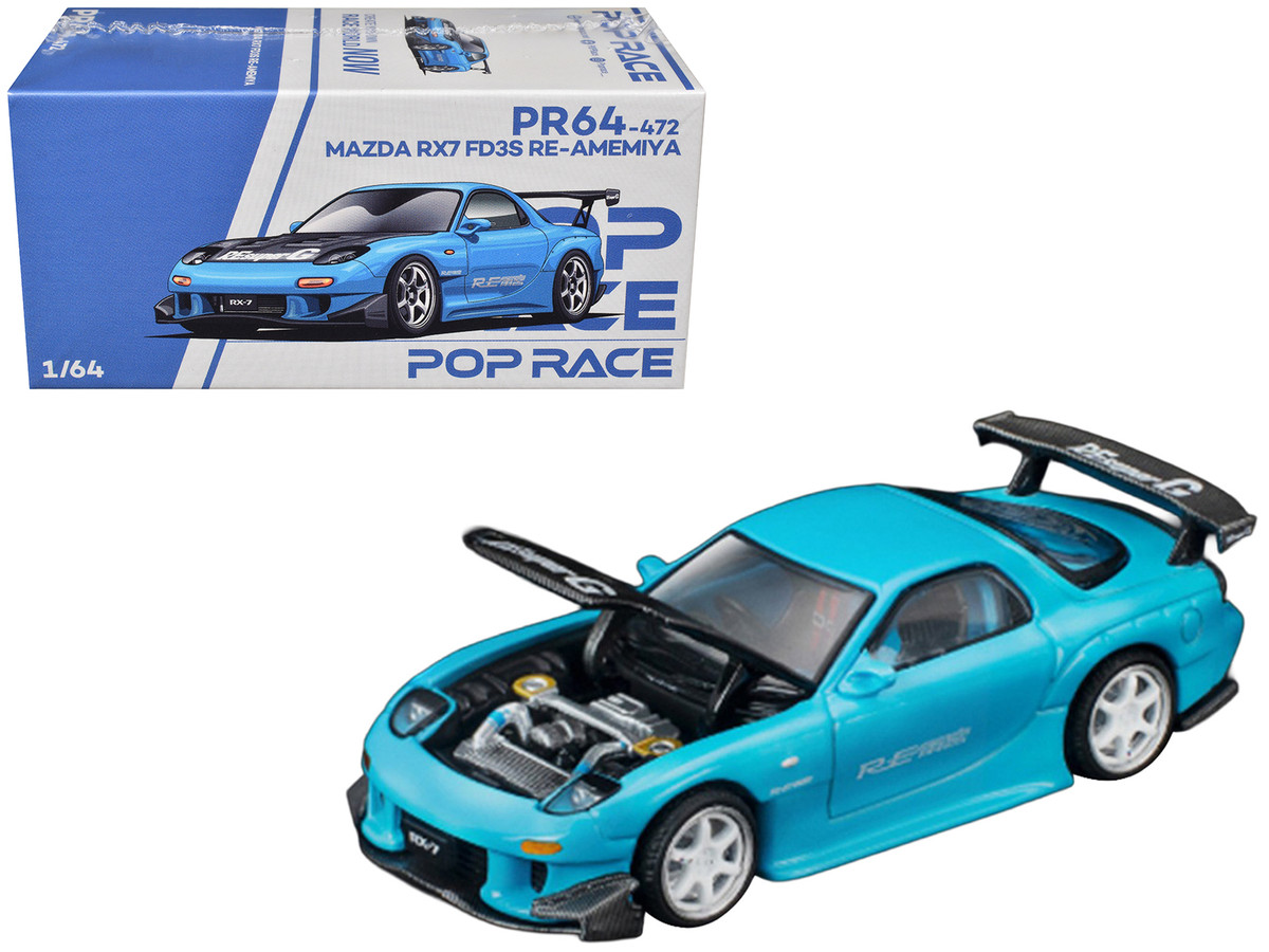 - Mazda RX7 (FD3S) RE Amemiya RHD (Right Hand Drive) Light Blue with Carbon Hood "Tokyo Auto Salon 2026" 1/64 Diecast Model Car by Pop Race